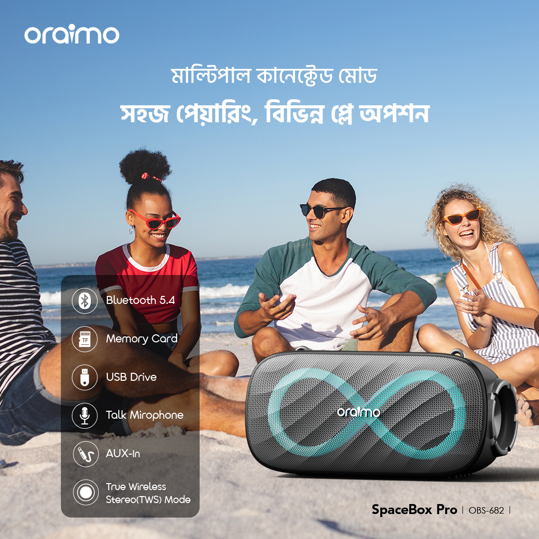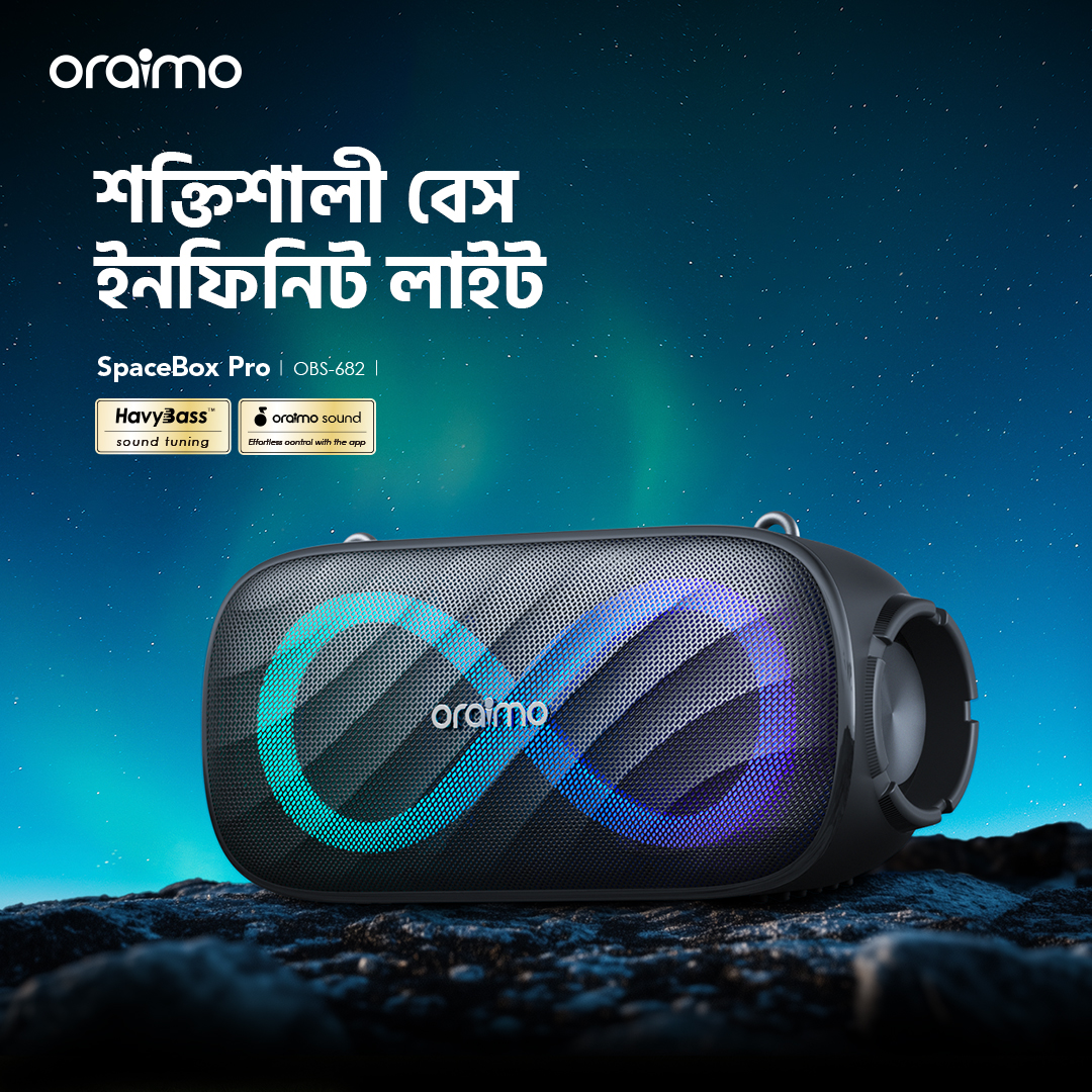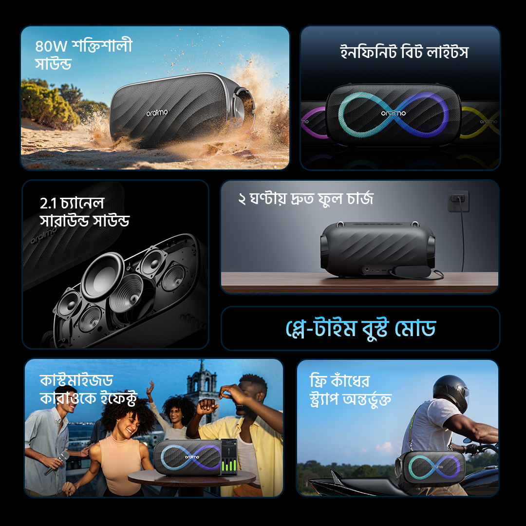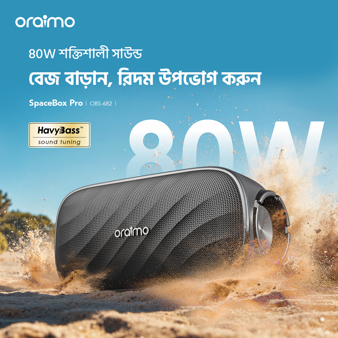 ডুয়াল ডিজিটাল অ্যাম্প চিপ এবং HavyBass™ প্রযুক্তির মাধ্যমে উপভোগ করুন ৮০W শক্তিশালী oraimo সাউন্ড। Bass Mode চালু করে বেজ ও ড্রামের অনুভূতি পান আরও গভীর ও শক্তিশালীভাবে—আপনার অ্যাডভেঞ্চারে যোগ হোক এক নতুন ছন্দ!