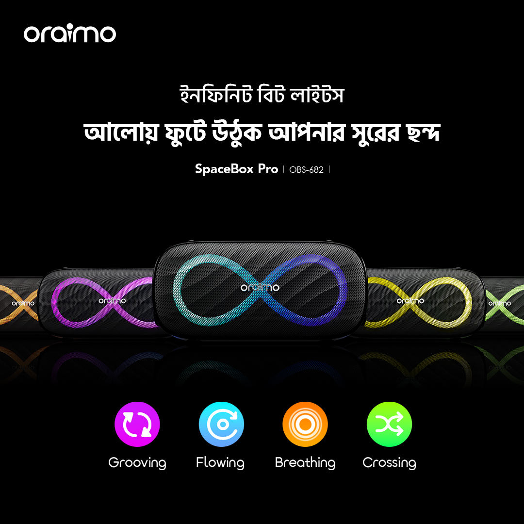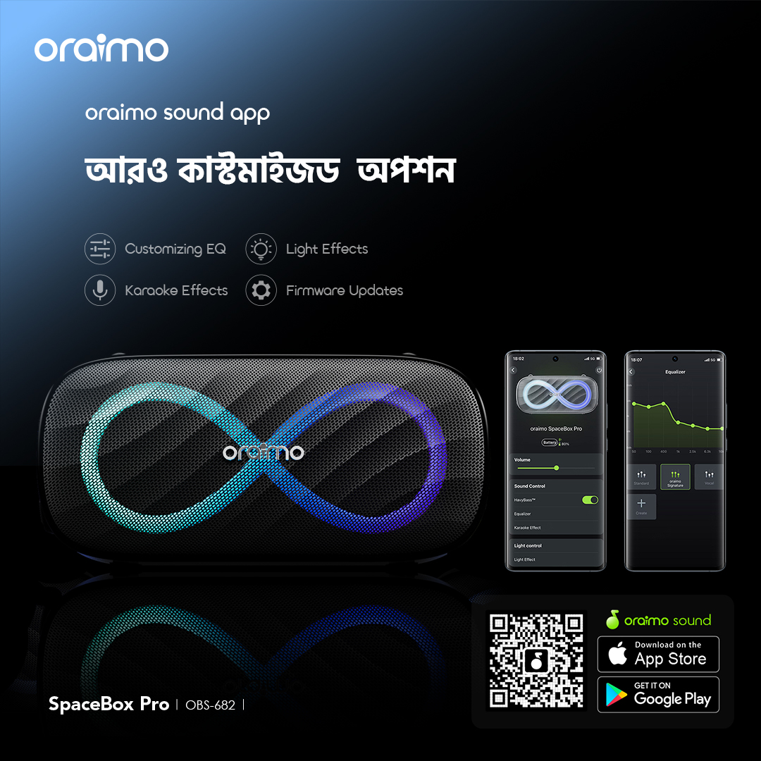 oraimo-র বিশেষ বিট-অ্যাডাপটিভ অ্যালগরিদম ব্যবহার করে ইনফিনিট লাইটশো আপনার মিউজিককে রূপ দেয় এক চোখধাঁধানো ভিজ্যুয়াল দৃশ্যে। oraimo sound অ্যাপ দিয়ে লাইটের মুভমেন্ট ও রঙ নিজের মতো করে সাজিয়ে তুলুন আপনার পার্টিকে আরও জমজমাট।