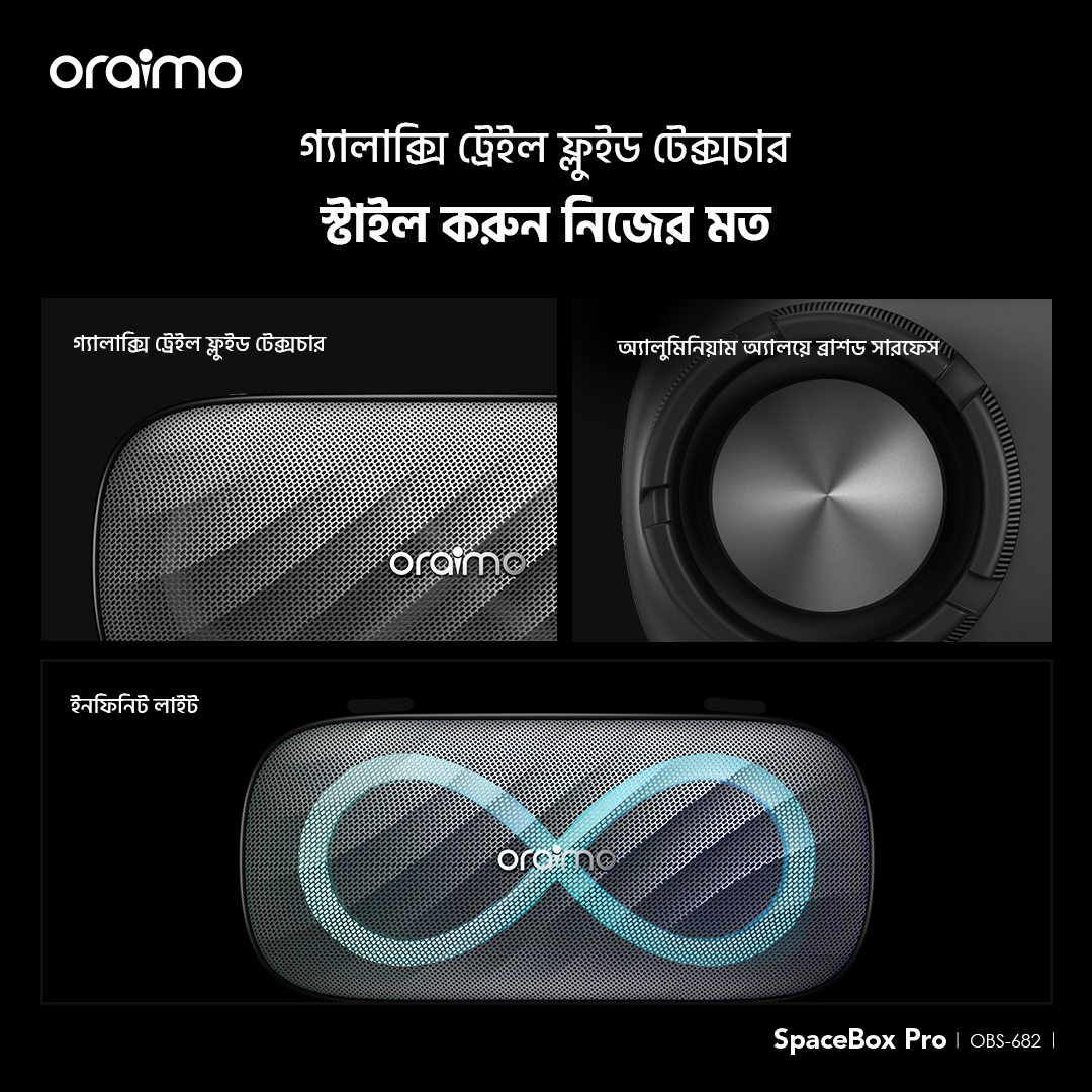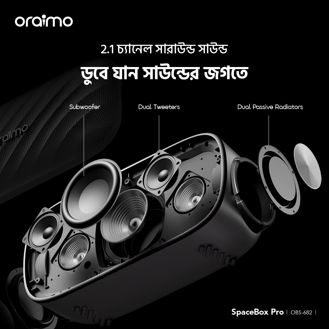 SpaceBox Pro-তে আছে ৪ ইঞ্চির সাবউফার, দুটি ২ ইঞ্চির টুইটার এবং দুটি ৩ ইঞ্চির প্যাসিভ রেডিয়েটর, যা একসাথে মিলে দেয় ভারী বেজ আর পরিষ্কার শব্দ। আপনার গান শোনার অভিজ্ঞতা হবে আরও প্রাণবন্ত।