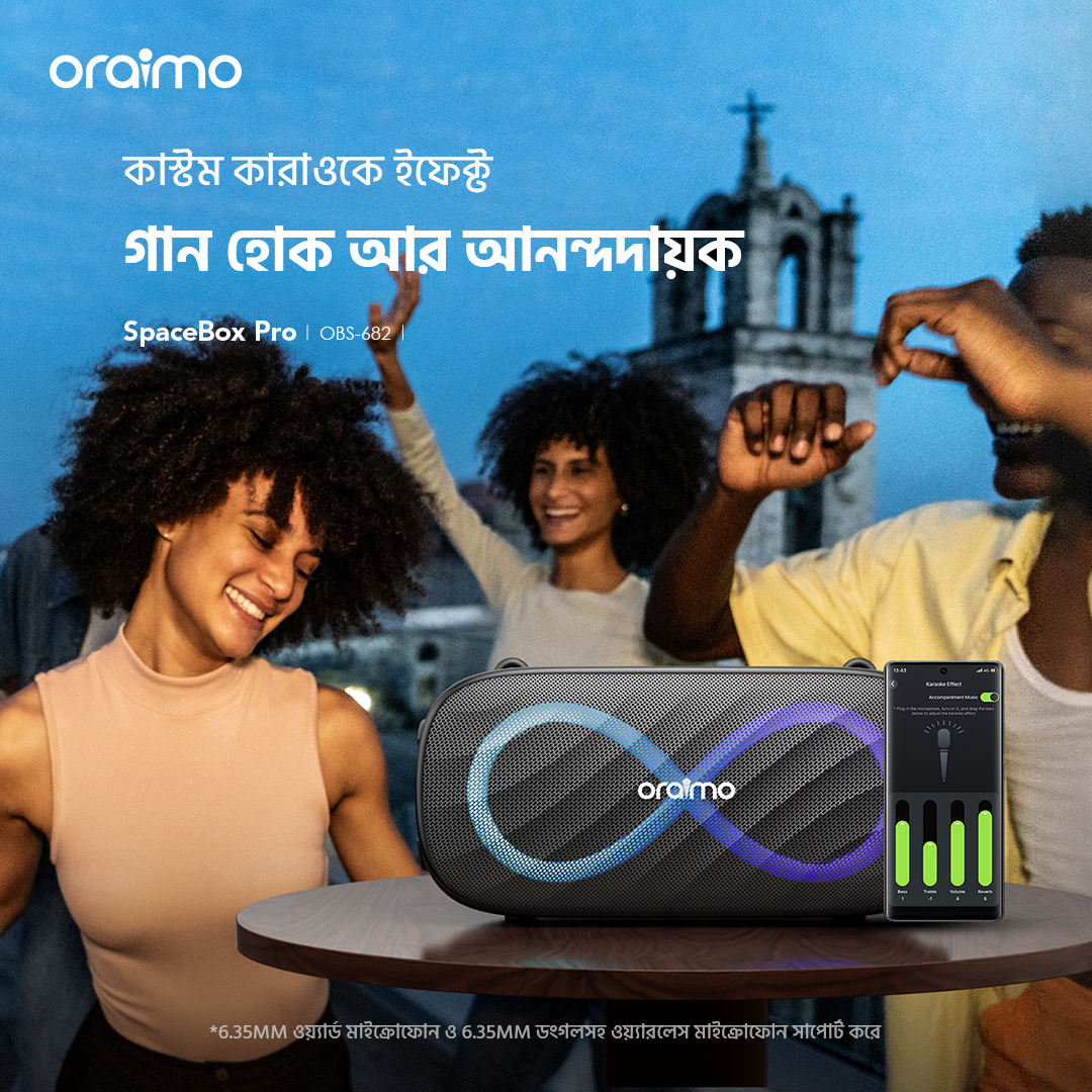 মাইক্রোফোন (প্যাকেজে নেই) লাগিয়ে কারাওকে পার্টি শুরু করুন। oraimo sound অ্যাপ দিয়ে সহজেই বেস, ট্রেবল, রিভার্ব আর ব্যাকগ্রাউন্ড মিউজিক ঠিক করে নিন। গানে আপনি-ই হবেন তারকা!