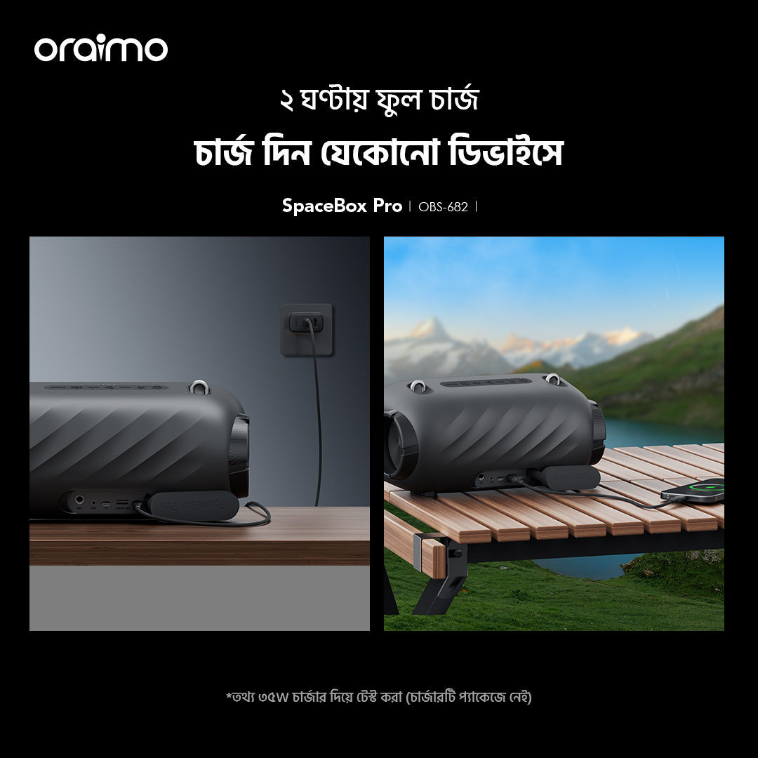 SpaceBox Pro মাত্র ২ ঘণ্টায় ফুল চার্জ হয় ৩৫W চার্জার দিয়ে। এর ভিতরের ১০W পাওয়ারব্যাংক দিয়ে আপনি আপনার ফোন বা অন্য ডিভাইসও চার্জ দিতে পারবেন সহজেই।