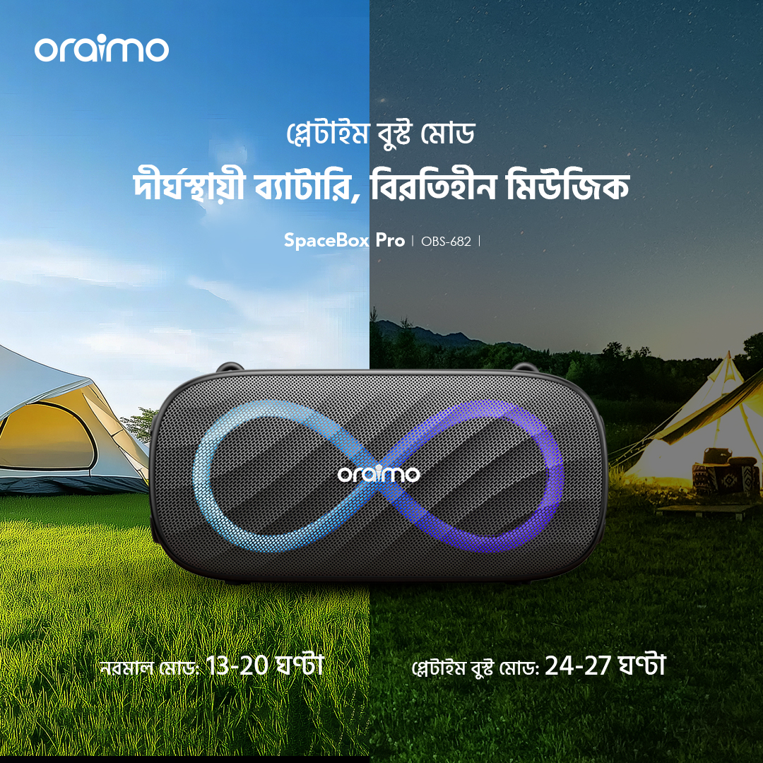 যেকোনো জায়গায় ১৩-২০ ঘণ্টা পর্যন্ত গান উপভোগ করুন। আর যদি oraimo sound অ্যাপে গিয়ে প্লেটাইম বুস্ট মোড চালু করেন, তাহলে উপভোগ করুন ২৪-২৭ ঘণ্টা পর্যন্ত মিউজিক।